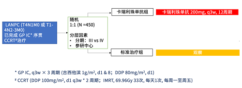 DIPPER研究[1,2]是一项开放标签的随机、对照、Ⅲ期临床研究。研究入组局部晚期的鼻咽癌患者(T4N1M0、T1-4N2-3M0,AJCC V8),在接受3个周期GP诱导化疗(吉西他滨:1000mg/m2,D1,8,Q3W;顺铂:80mg/m2 D1,Q3W)序贯根治性同步放化疗(IMRT,66.96Gy,33f;顺铂100mg/m2;Q3W,2周期)之后,按照1:1的比例随机,试验组接受卡瑞利珠单抗(200mg,D1,Q3W)单药治疗共12个周期,对照组则进入随访观察。研究的主要终点为无事件生存(EFS),次要研究终点包括无远处复发生存(DMFS)、无区域复发生存(LRRFS)、总生存(OS)、患者报告结局(PRO)和安全性。